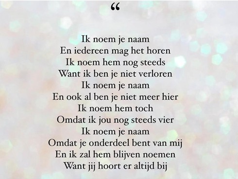 ‘Waar je ook bent, ik zou het niet weten. Niet in afstand of tijd te meten Maar ik heb je bij me, diep in mij, Daarom ben je zo dichtbij Toon Hermans’.
